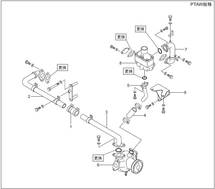1.4 三菱S6R發動機空氣冷卻器用水泵、三菱S6R發動機恒溫器、水管的拆卸,檢修