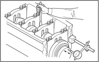 (3) 用撬棒撥動三菱S6R柴油發動機曲軸,測量三菱S6R柴油發動機曲軸前后移動的最大差值,檢測軸向間隙值。超過標準值時,檢測推力片和三菱S6R柴油發動機曲軸。標準值以內時,在最后端的三菱S6R柴油發動機主軸承瓦端蓋螺栓旋松的狀態前后移動三菱S6R柴油發動機曲軸,再次檢測。