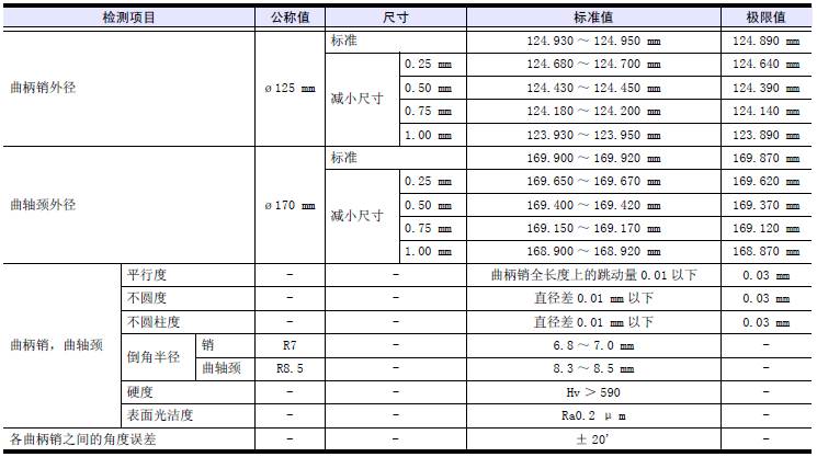 超過極限值時,使用加厚尺寸的軸瓦,按照和加厚尺寸軸瓦的規格研磨三菱S12柴油發動機曲軸。使用1.00 mm 規格的加厚尺寸主軸瓦仍然超出極限值時,更換新的三菱S12柴油發動機曲軸。