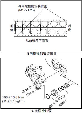 (3) 在三菱S12柴油發(fā)動(dòng)機(jī)缸體安裝2 個(gè)導(dǎo)向螺栓,安裝油底殼。