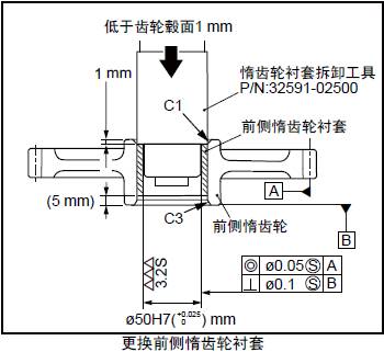 (2) 使用三菱R16柴油發動機惰齒輪襯套拆卸工具的裝入端,從1mm 倒角的端面壓入,將前三菱R16柴油發動機惰齒輪襯套壓入至齒輪轂的端面平齊。再用三菱R16柴油發動機惰齒輪襯套拆卸工具的拆卸端,將襯套端面壓入至低于齒輪轂端面約1mm。