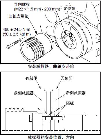 (2) 按照隔板、內側的三菱R16柴油發動機減振器、隔板、外側的三菱R16柴油發動機減振器、三菱R16柴油發動機曲軸三菱S16柴油機皮帶輪的順序,通過導向螺栓,對準定位銷進行安裝。