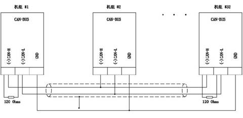 并機(jī)系統(tǒng)中的機(jī)組之間的起停順序、負(fù)載分配、開關(guān)閉合時(shí)間等各種功能都是通過各并機(jī)并網(wǎng)并聯(lián)控制器的數(shù)據(jù)聯(lián)機(jī)進(jìn)行通信,然后由控制器進(jìn)行數(shù)據(jù)處理并發(fā)出相應(yīng)控制命令,從而實(shí)現(xiàn)對各機(jī)組的并車控制。通信采用 RS-485網(wǎng)絡(luò),其在并機(jī)并網(wǎng)并聯(lián)控制器中的聯(lián)機(jī)示意圖如下: