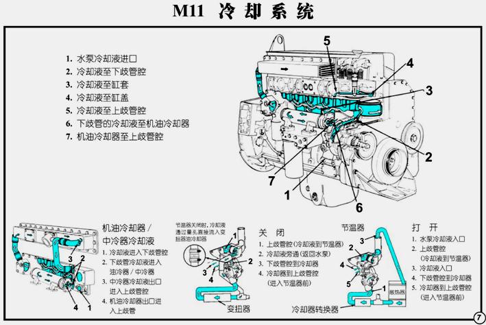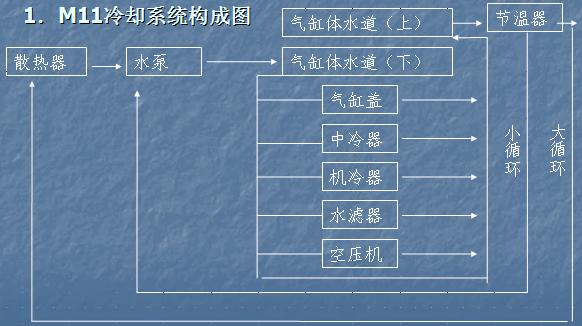 由散熱器、水泵、氣缸體水道、氣缸蓋水道、出水管、節溫器、水濾器、中冷器、機油冷卻器、以及選用件空氣壓縮機、液壓油冷卻器。