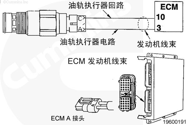 油軌執行器電路圖向油軌執行器提供電流。CM500 ECM 向油軌執行器指派變動的電流量來控制噴油器油軌壓力量。