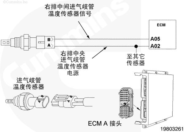 右排中間進(jìn)氣歧管溫度傳感器電路圖向 CENSE™ ECM 提供右排中間進(jìn)氣歧管空氣溫度信號(hào)。