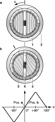 1-磁軛 2-定子(1,2軟鐵)3-轉(zhuǎn)子 4-空氣氣隙 5-霍爾感應元件 φ-轉(zhuǎn)角