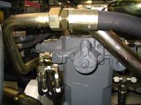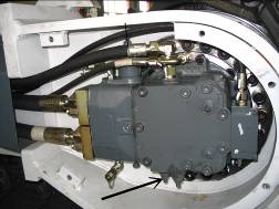 斷開回轉(zhuǎn)馬達(dá)制動油口,如下圖。在斷開的油管上接一測口,在斷開的馬達(dá)接頭處接堵頭。