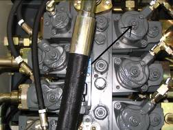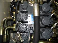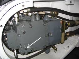按下控制屏上“F3”鍵,快速回收鏟斗,讀出回油壓力,應(yīng)為90--100 bar,如果達(dá)不到,就調(diào)工作閥塊第二個黑六角螺釘,如下圖。