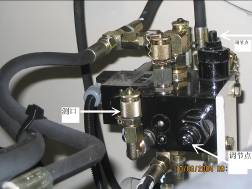 應(yīng)為390 bar,否則調(diào)節(jié)工作閥塊動臂調(diào)節(jié)螺釘 ,如下圖里側(cè)螺釘。