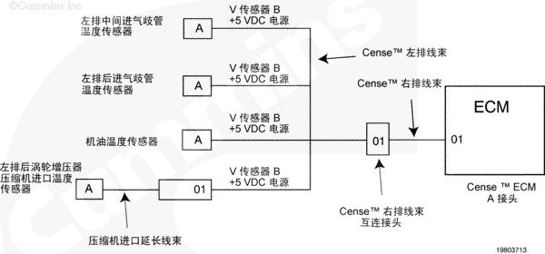 康明斯QSK78電子控制模塊 (ECM) 通過(guò) CENSE™ ECM A 接頭上的觸針 01 向 CENSE™ 線(xiàn)束上的傳感器提供 +5 VDC 供電。當(dāng)一個(gè)大于 5 VDC 的電壓源短接到該電路圖時(shí),所有連接到該傳感器的電源都會(huì)發(fā)生多個(gè)故障。發(fā)生這種情況是因?yàn)樗羞B接到該電源的部件信號(hào)電路圖電壓將上升到高于該部件的超出正常范圍(高壓短路)閾值。