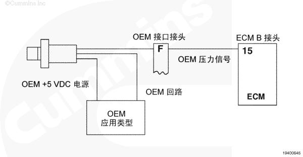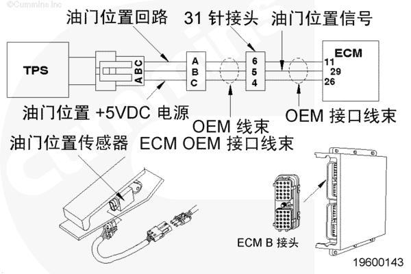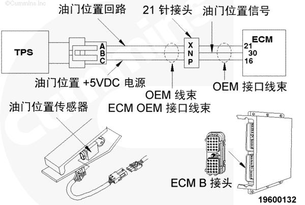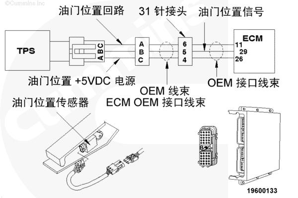 油門(mén)踏板通過(guò) OEM 線(xiàn)束和 OEM 接口線(xiàn)束向 CM500 ECM 提供駕駛員油門(mén)指令。CM500 ECM 利用此信號(hào)來(lái)確定燃油油軌執(zhí)行器閥的供油指令。