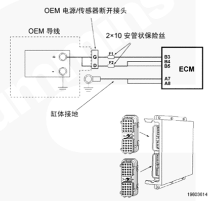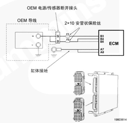 CM500 ECM 通過(guò) OEM 線(xiàn)束和康明斯QSK78發(fā)動(dòng)機(jī)線(xiàn)束接收無(wú)開(kāi)關(guān)蓄電池電壓。OEM 接口線(xiàn)束的無(wú)開(kāi)關(guān)蓄電池導(dǎo)線(xiàn)中有兩個(gè)個(gè)串聯(lián)式 10 安培保險(xiǎn)絲,以保護(hù) CM500 ECM。康明斯QSK78發(fā)動(dòng)機(jī)線(xiàn)束中的蓄電池回路導(dǎo)線(xiàn)連至康明斯QSK78發(fā)動(dòng)機(jī)缸體接地。