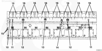 對缸體進行了改動以便能夠安裝較長的缸蓋螺釘。以前的康明斯發動機必須使用長度為 171 mm [6.73 in] 的螺釘。現在的康明斯發動機必須使用長度為 203 mm [8.00 in] 的螺釘。短螺釘可用于維修。這些螺釘都是鍍鎘的(銀色或金色)。必須將這些短螺釘擰緊至 353 N•m [260 ft-lb]。如果短螺釘表面具有 lubrite 鍍層,而且顏色是黑色,則必須予以更換。203 mm [8 in] 螺釘只能使用 lubrite 鍍層。555 N•m [409 ft-lb] 扭矩必須施加在這些螺釘上。K50 康明斯發動機總是使用 203 mm [8.00 in] 螺釘。