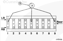 在 K50 康明斯發動機上,將環放到“1”、“5”和“9”號主軸承鞍座中。