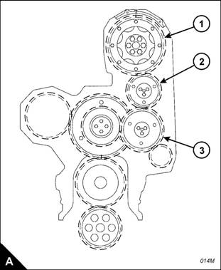 Remove the main idler gear (A). Hold the camshaft gear stationary and use a dial tes t indicator (DTI),