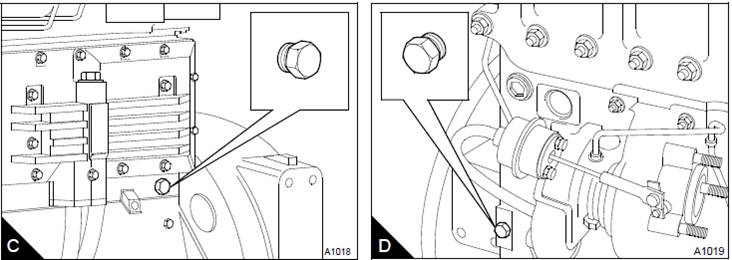 4從Perkins1000/4/6缸缸體的側(cè)面拆下排放螺塞(C或D)以便排放發(fā)動機(jī)。確保排放孔未被堵塞。