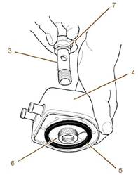 4.拆下調(diào)整螺釘(7)。從殼體(3)拆卸發(fā)動(dòng)機(jī)機(jī)油冷卻器(2)和油封(5)。棄置油封(5)。