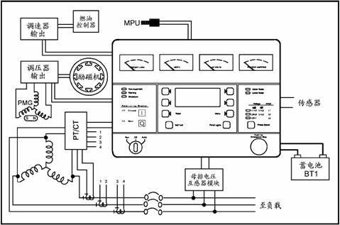 由外部的電壓/電流互感器(PT/CT)模塊將發電機電壓降至18VAC,并經由電流互感器(CT)輸出電流產生一個參考交流電壓,通過電壓調節向調壓器輸出模塊輸出一個低功率PWM信號,然后向勵磁機定子輸出一個放大信號。機油、冷卻液和排煙溫度由可變電阻傳感器傳送信號,機油壓力由電容式傳感器傳送信號。