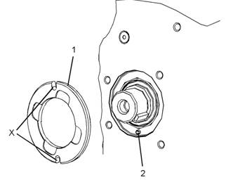 7用清潔的發動機機油潤滑止推墊圈。對齊止推墊圈(1)中的槽(X)與缸體中的定位銷(2)。將止推墊圈(1)安裝到缸體的凹槽中。