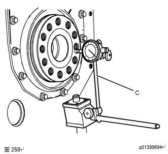 15.檢查曲軸的軸向間隙。向發動機前部推動曲軸。將工具(C)安裝到缸體及曲軸后表面上。向發動機后部推動曲軸。使用工具(C)測量曲軸軸向間隙。曲軸允許的軸向間隙為0.10mm(0.004in)至0.41mm(0.016in)。
