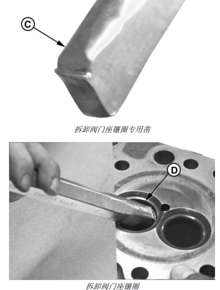 重要提示: 拆卸閥門座時,注意不要損壞汽缸蓋。閥門座只能由熟悉操作步驟、有經驗的人員拆卸。