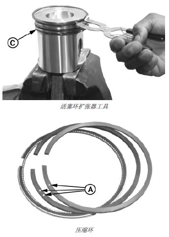 5. 將方形壓縮環(huán)的開(kāi)口定位在活塞控油環(huán) (C) 開(kāi)口的對(duì)面。