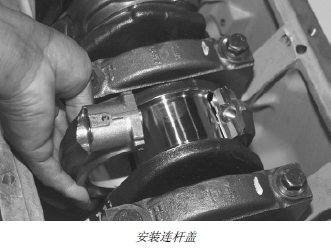10. 用新帶帽螺釘安裝帶軸瓦的連桿蓋。(有關安裝和擰緊連桿帶帽螺釘的信息,請參見第 030 章的“安裝活塞和連桿”部分。)