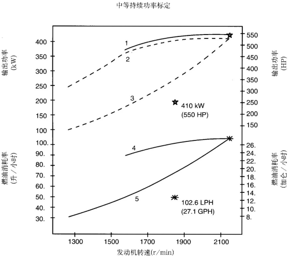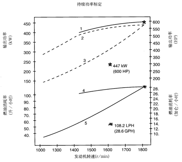 標(biāo)定條件:功率標(biāo)定是基于ISO8665標(biāo)準(zhǔn)規(guī)定的條件:大氣壓力為100kPa (29.612英寸汞柱),環(huán)境溫度為25℃(77°F),相對(duì)濕度為30%。螺旋槳軸功率為按97%扣除齒輪箱損失后的凈功率。燃油消耗是基于使用比重為838.9g/l(7.001磅/加侖),LHV為42780kJ/kW(18390Btu/lb)的35°API燃油。 1. 制動(dòng)功率 kW(HP) 4. 軸功率對(duì)應(yīng)的燃油消耗 2. 扣除齒輪箱損失后的軸功率 kW(HP) 5. 螺旋槳推進(jìn)曲線對(duì)應(yīng)的燃油消耗 3. 螺旋槳推進(jìn)曲線 持續(xù)功率:這種功率標(biāo)定的發(fā)動(dòng)機(jī)允許在全負(fù)荷工況下連續(xù)不斷地使用。這種功率為ISO3046標(biāo)準(zhǔn)功率 * 對(duì)非LTA發(fā)動(dòng)機(jī),其燃油耗高1-3%。 | ||||||