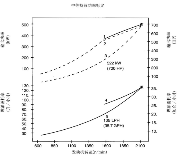 標(biāo)定條件:功率標(biāo)定是基于ISO8665和SAE J1228標(biāo)準(zhǔn)規(guī)定的條件:大氣壓力100kPa (29.612英寸汞柱),環(huán)境溫度為25℃(77°F),相對(duì)濕度為30%。螺旋槳軸功率為按97%扣除齒輪箱損失后的凈功率。燃油消耗是基于使用16℃(60°F)比重為838.9g/l(7.001磅/加侖),LHV為42780kJ/kg(18390Btu/lb)的35°API燃油。 13. 制動(dòng)功率 kW(HP) 4. 軸功率對(duì)應(yīng)的燃油消耗 14. 扣除齒輪箱損失后的軸功率 kW(HP) 5. 螺旋槳推進(jìn)曲線對(duì)應(yīng)的燃油消耗 15. 螺旋槳推進(jìn)曲線 中等持續(xù)功率:允許發(fā)動(dòng)機(jī)在變負(fù)荷工況下連續(xù)使用,每12個(gè)小時(shí)連續(xù)運(yùn)轉(zhuǎn)期間內(nèi),其全負(fù)荷運(yùn)轉(zhuǎn)時(shí)間不超過(guò)6小時(shí)。降功率運(yùn)轉(zhuǎn)必須在最大標(biāo)定轉(zhuǎn)速以下200rpm范圍內(nèi)。該功率標(biāo)定符合ISO3046中的“燃油限止功率標(biāo)定”,用于每年運(yùn)行時(shí)間不超過(guò)3000小時(shí)的船舶。 * 對(duì)非LTA發(fā)動(dòng)機(jī),其燃油耗高1-3%。 | ||||||