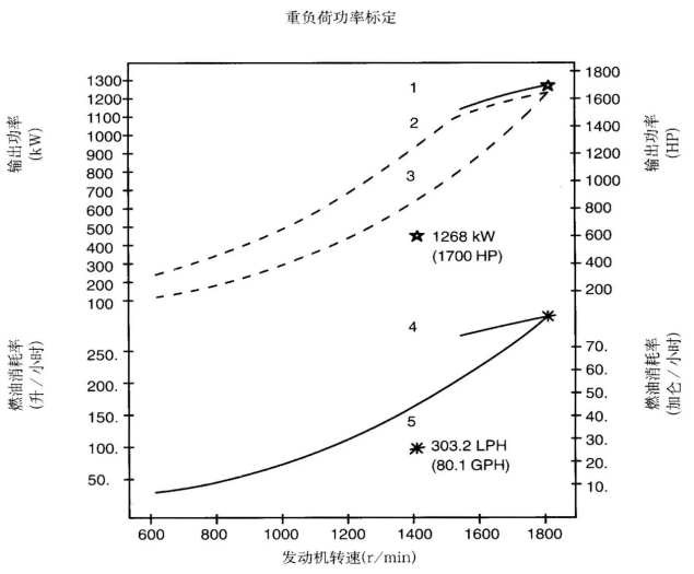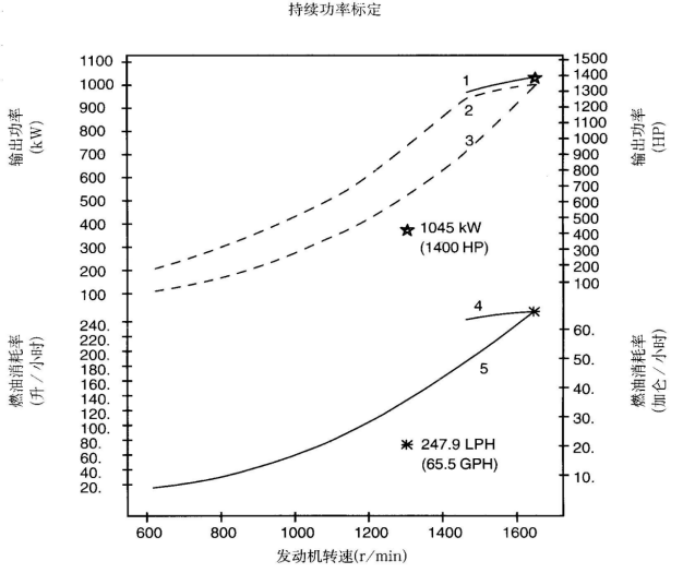 標(biāo)定條件:功率標(biāo)定是基于ISO8665標(biāo)準(zhǔn)規(guī)定的條件:大氣壓力為100kPa (29.612英寸汞柱),環(huán)境溫度為25℃(77°F),相對(duì)濕度為30%。螺旋槳軸功率為按97%扣除齒輪箱損失后的凈功率。燃油消耗是基于使用比重為838.9g/l(7.001磅/加侖),LHV為42780kJ/kW(18390Btu/lb)的35°API燃油。 1. 制動(dòng)功率 kW(HP) 4. 軸功率對(duì)應(yīng)的燃油消耗 2. 扣除齒輪箱損失后的軸功率 kW(HP) 5. 螺旋槳推進(jìn)曲線對(duì)應(yīng)的燃油消耗 3. 螺旋槳推進(jìn)曲線 持續(xù)功率:這種功率標(biāo)定的康明斯發(fā)動(dòng)機(jī)允許在全負(fù)荷工況下連續(xù)不斷地使用。這種功率為ISO3046標(biāo)準(zhǔn)功率 * 對(duì)非LTA康明斯發(fā)動(dòng)機(jī),其燃油耗高1-3%。 | ||||||