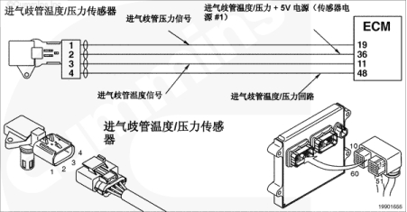進氣歧管 1 壓力傳感器電路 - 電壓低于正常值或對低壓電源短路。在進氣歧管壓力電路中檢測到低信號電壓或開路。 |