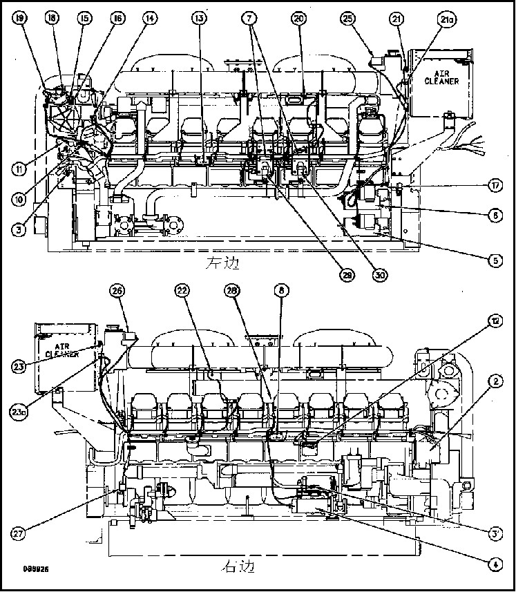 2.充電機 3.發動機電控器,4.預潤滑馬達, 5.起動馬達,6.起動馬達 7.電阻器,8.充電機斷路器.10.后冷卻器溫度傳感器.11.大氣壓力傳感器.12.曲軸箱壓力傳感器.13.發動機電控器(ECM)斷路器.14.發動機冷卻液溫度傳感器.15. 已過濾機油壓力傳感器.16. 未過濾機油壓力傳感器.17.發動機正時\轉速傳感器.18.燃油濾清器壓力傳感器(已過濾).19.燃油濾清器壓力傳感器(未過濾).20.左排氣溫度傳感器.21.左渦輪增壓進氣壓力傳感器.22.右排氣溫度傳感器.23.右渦輪增壓進氣壓力傳感器.24.渦輪增壓氣輸入壓力傳感器.25.空氣關斷電磁閥(左,選配件).26.空氣關斷電磁閥(右,選配件).28.噴油器電磁閥 29.輔助起動電磁閥.30.輔助起動電磁閥.31.預潤滑壓力開關(選配件).