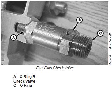 2. Disconnect fuel line (shown disconnected) and remove check valve (B). Remove O-rings (A) and (C) from both ends of check valve.