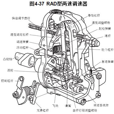 圖4 - 37所示為CA1091 K3型載貨汽車柴油機所用的RAD型兩速調速器,其調速原理結構示意圖如圖4-38所示。