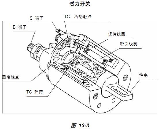 圖 13-3所示為磁力起動(dòng)馬達(dá)電磁閥。磁力開(kāi)關(guān)有下列主要功用:•吸引柱塞來(lái)推出小齒輪,使其與洋馬發(fā)動(dòng)機(jī)齒圈嚙合。•閉合活動(dòng)觸點(diǎn),使蓄電池電流流過(guò)電樞。