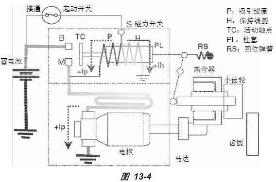 小齒輪的移動(dòng)圖 13-4所示為洋馬柴油機(jī)起動(dòng)馬達(dá)電路中小齒輪和活塞觸點(diǎn)的移動(dòng)以及電流的流動(dòng)。