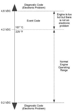 典型模擬溫度傳感器的輸出電壓圖8表示了一個典型模擬傳感器的信號范圍。如果傳感器輸出信號低于0.2 VDC或高于4.8 VDC,就會生成診斷代碼。 動態診斷代碼激活的診斷代碼代表了電氣控制系統的問題。盡可能快地糾正問題。當生成一個動態診斷代碼時,“ 動態警告” 指示燈(在卡特ET“ 發動機控制警告狀態” 上)被激活,以警告操作者。如果生成卡特cat代碼的情況是暫時的,信息會從動態診斷代碼清單中消失。診斷代碼變為日志。
