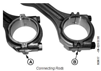 早期的強鹿約翰迪爾John Deere柴油發動機在連桿和蓋(A)之間有傳統的榫槽。后來的強鹿約翰迪爾John Deere柴油發動機有精密接頭 桿和蓋(B)。