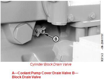 A—Coolant Pump Cover Drain Valve B—Block Drain Valve