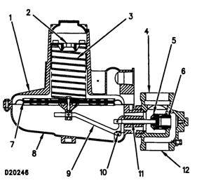 (1)彈簧側室(2)調節螺絲(3)彈簧(4)出口(5)閥盤(6)主噴嘴(7)主通風口(8)控制桿側室(9)控制桿(10)鎖銷(11)閥桿(12)進氣口