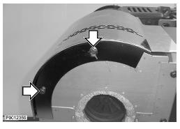 21 安裝所有頂部隔熱罩螺釘,然后擰緊兩個扣環。緊固所有螺栓。