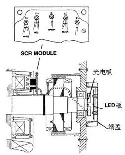LED裝在發電機軸的端部,對著在軸上旋轉的光敏晶體管。光敏晶體管接收來自LED的信號,按要求比如調壓器的指令來指示SCR旋轉橋開通或關斷。