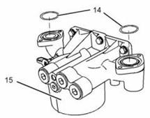 11. 從卡特C13珀金斯2206發(fā)動機機油冷卻器機油濾清器底座(15)上拆下O形密封圈(14)。