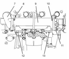 8. 安裝螺栓(12)和(13)。將螺栓擰緊至28 N•m(21 lb ft)的扭矩。