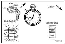 將車輛鑰匙開關扳至“ON”位置。如果沒有記錄現行故障代碼,兩個指示燈將亮起并保持這一狀態。如果記錄有現行故障代碼,兩個指示燈將瞬時亮起,然后開始閃爍記錄的故障代碼。