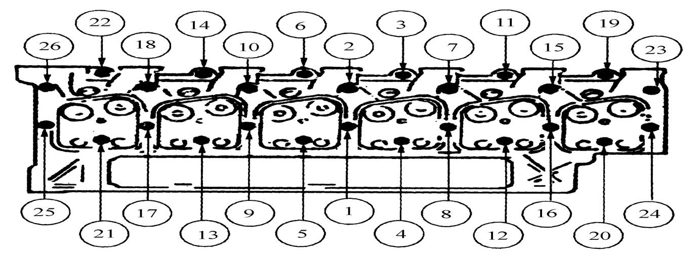 第3次:短、中缸蓋螺栓擰緊到90N·m,6根長(zhǎng)缸蓋螺栓擰緊到120 N·m;