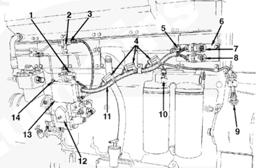 1燃料切斷閥,2空燃比控制傳感器管,3保險絲 (5A),4系統接地接頭,5 OEM C5 和 C6 接頭支架,6發動機轉速傳感器,7 C5 接頭,8 C6 接頭,9油軌壓力傳感器和燃油塊,10液壓機械式 STC 執行器,11發動機側數據通信接口接頭,12發動機線束,13燃油泵,14ECM,15電子燃油控制閥。