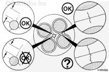 注: 氣門之間的裂紋兩端必須可見。如果裂紋的一端已延伸至氣門座孔(氣門座后),缸蓋的狀況可能有問題。確保缸蓋可以繼續使用,拆下氣門和氣門座。