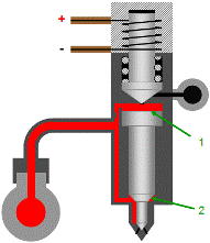 • 相同的燃油壓強施加在柱塞頂面 (1)和針閥凸臺區域 (2) 上